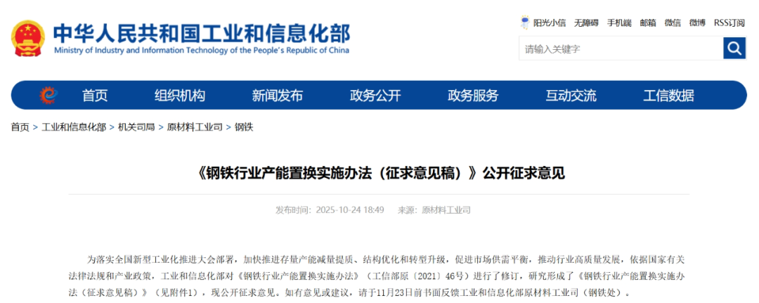 工信部網(wǎng)站10月24日消息,工業(yè)和信息化部對《鋼鐵行業(yè)產(chǎn)能置換實(shí)施辦法》進(jìn)行了修訂,研究形成了《鋼鐵行業(yè)產(chǎn)能置換實(shí)施辦法(征求意見稿)》,現(xiàn)公開征求意見。
